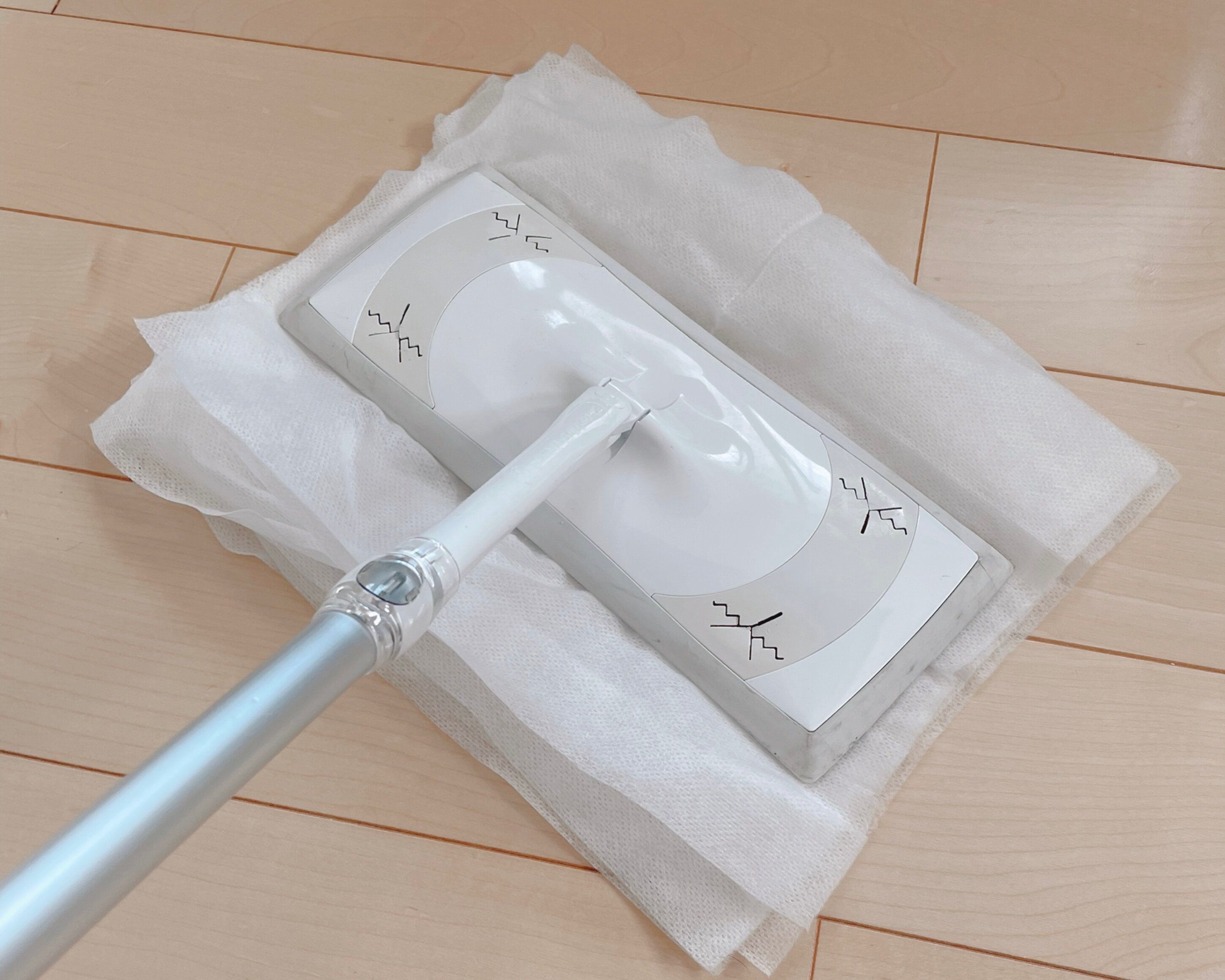 1.フローリングワイパーにあらかじめシートを重ねてセットしておく。