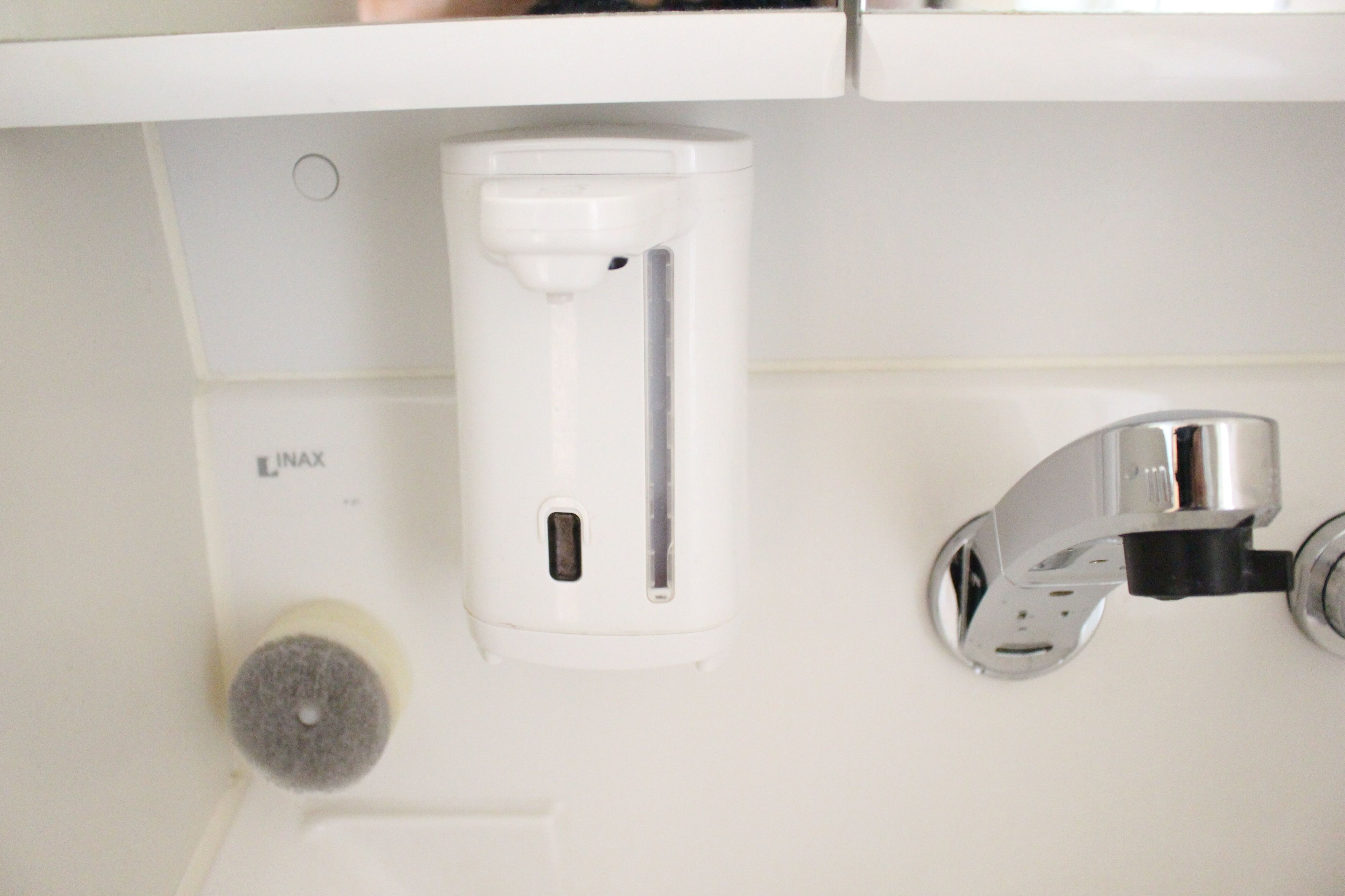 写真の小さなスポンジにハンドソープを付けて洗面台と蛇口部分を軽く擦り、仕上げにアルコールスプレーで鏡と蛇口を拭く。時間にすればわずか3分程度の作業です。