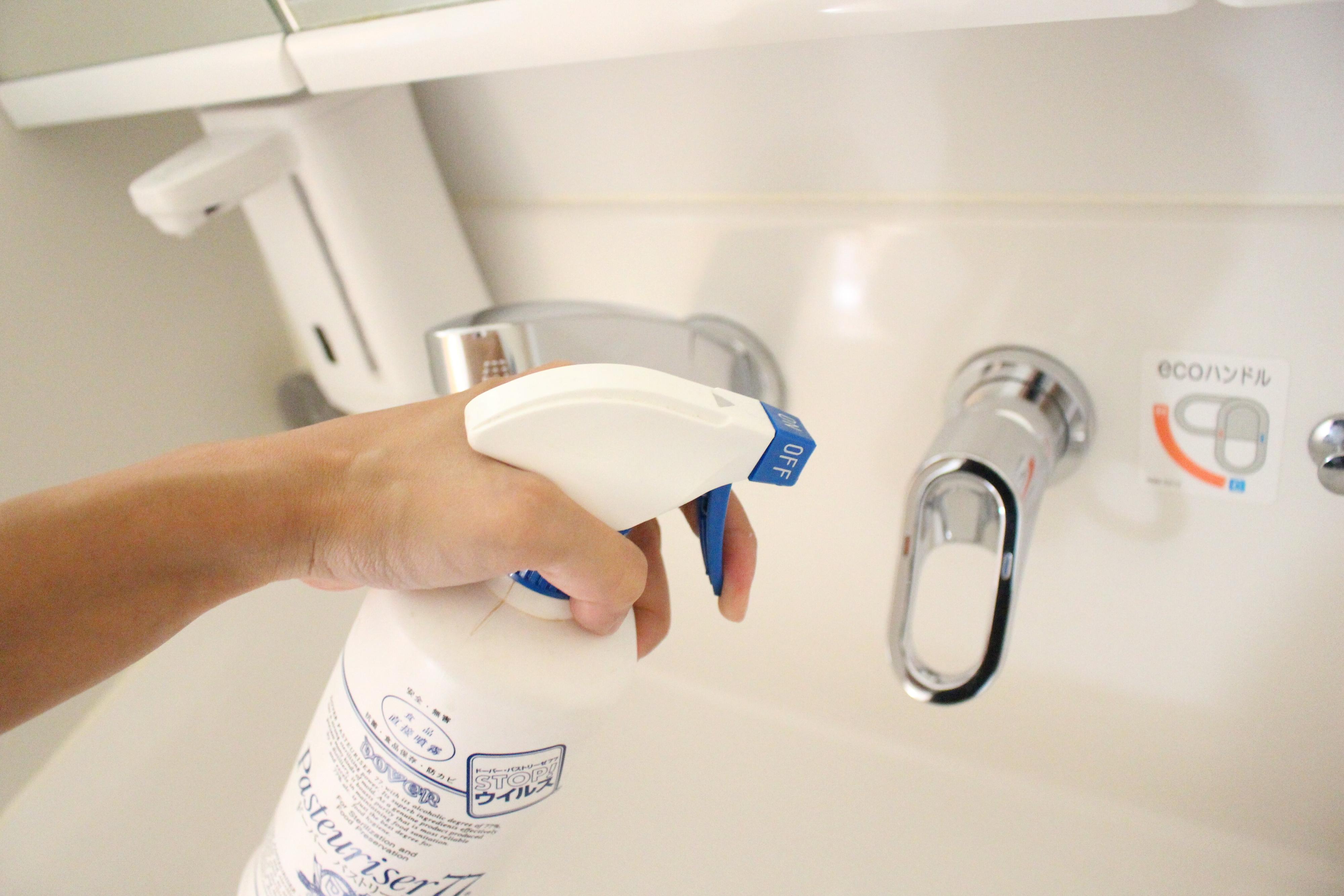 また、来客がある際にも必ずキレイにする箇所として、私は洗面台やトイレにある蛇口部分にアルコールスプレーを掛け、拭き取るようにしています。蛇口は使用頻度も高く、意外と訪れた人の目に付きやすい場所なので、部屋全体を充分に掃除する時間が無い場合でも、この部分だけはピカピカにしておきたい!というのが私なりのこだわりです。