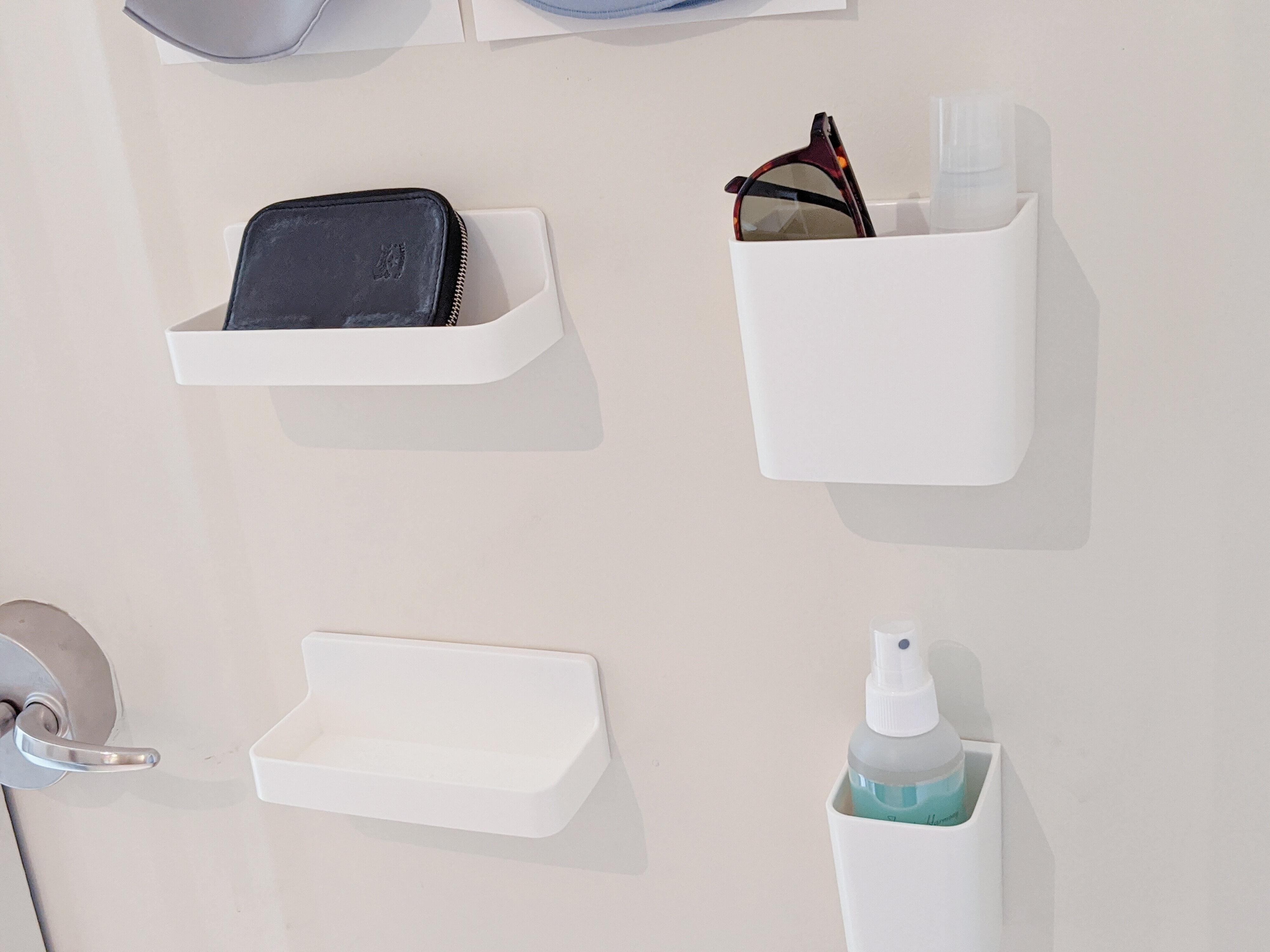 玄関扉吊り下げ収納のメリットは、必要なものがワンアクションで取れること、出かける前に忘れ物を防止することのほか、下駄箱などの上にものを置かずに済むので、帰宅したときすっきりした玄関に「ただいま」を言えることだと思います。