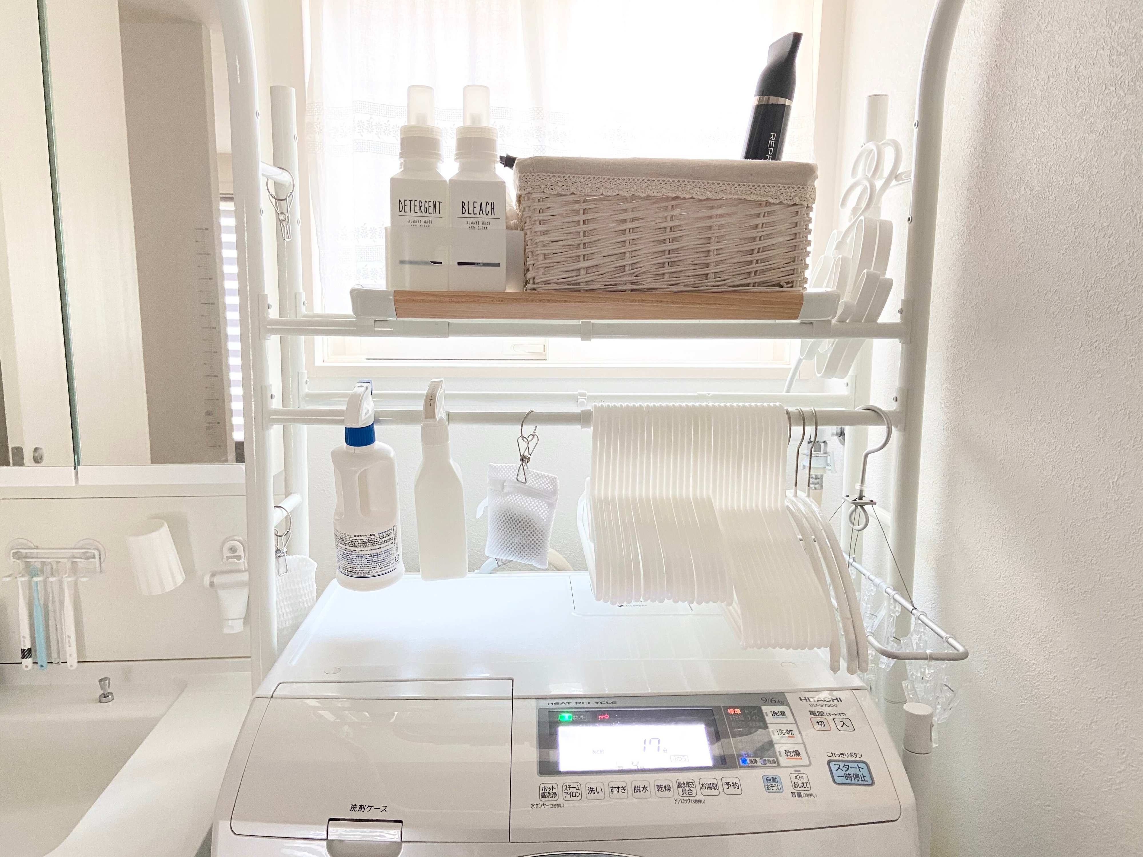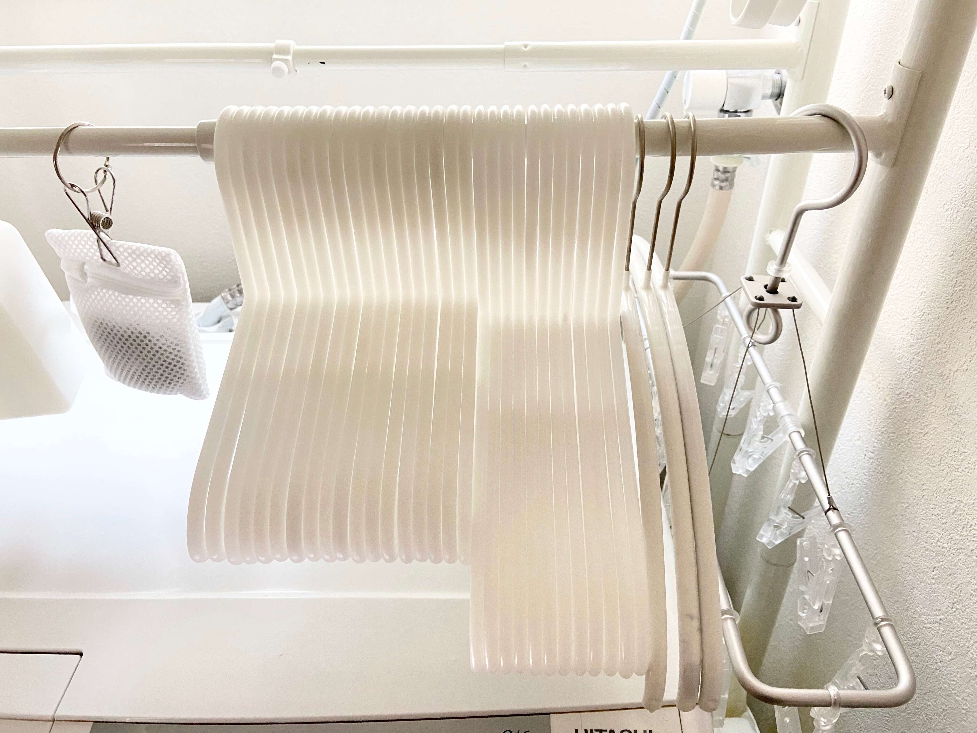 以前はハンガーは1階の廊下収納の中だったのですが、平日は部屋干し、梅雨時期など乾きが悪い時期はお風呂場で浴室乾燥、土日の天気の良い日は外干しをしており微妙に干している場所が違うので、動線を最短にさせるため洗濯機上に集結させました。