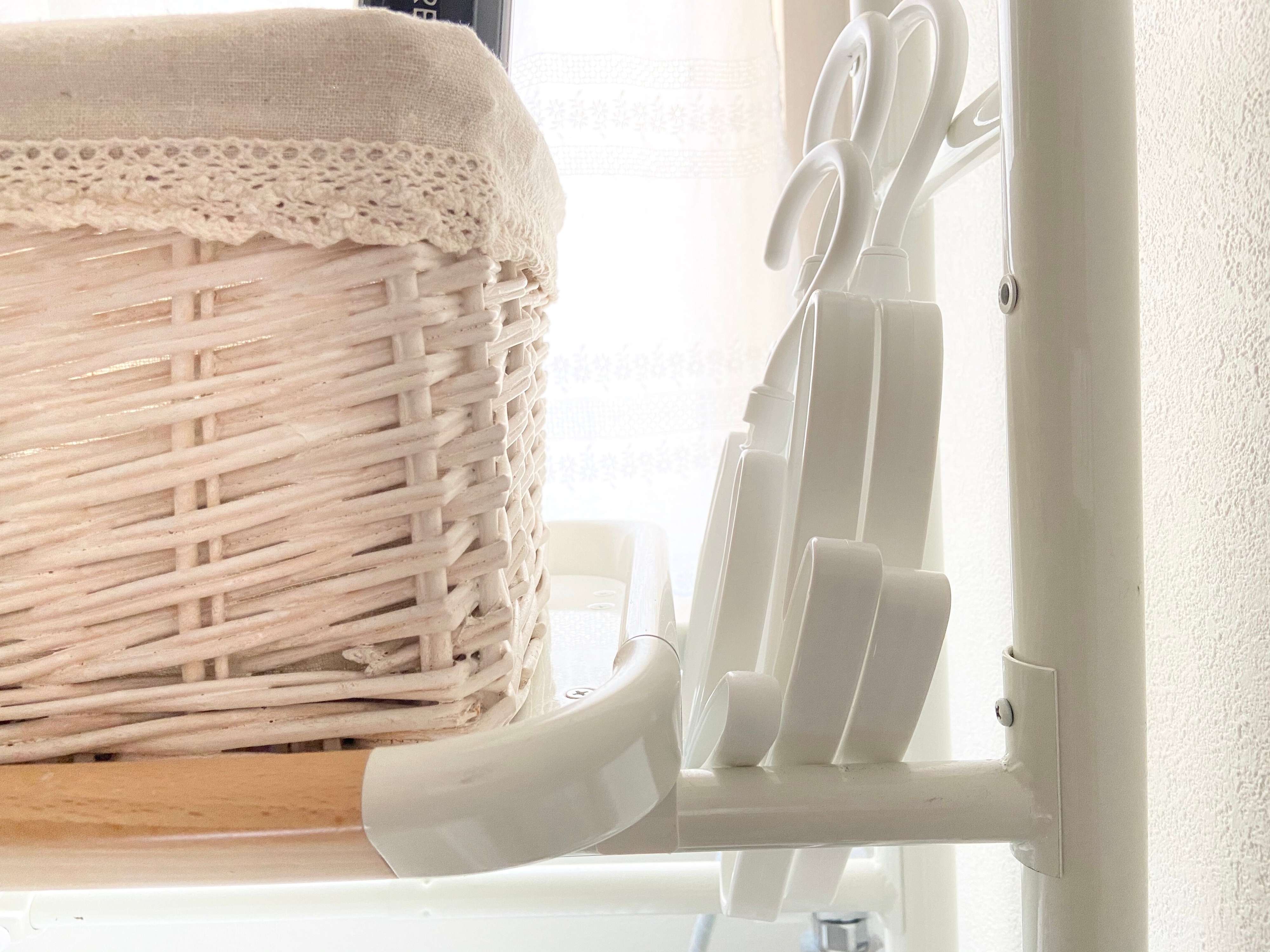 元々は棚が2つついていたのですが、色んなものを引っ掛け収納にしたかったので、棚1つは取り除いてしまい、高さも収納したいものに合わせて調整しています。