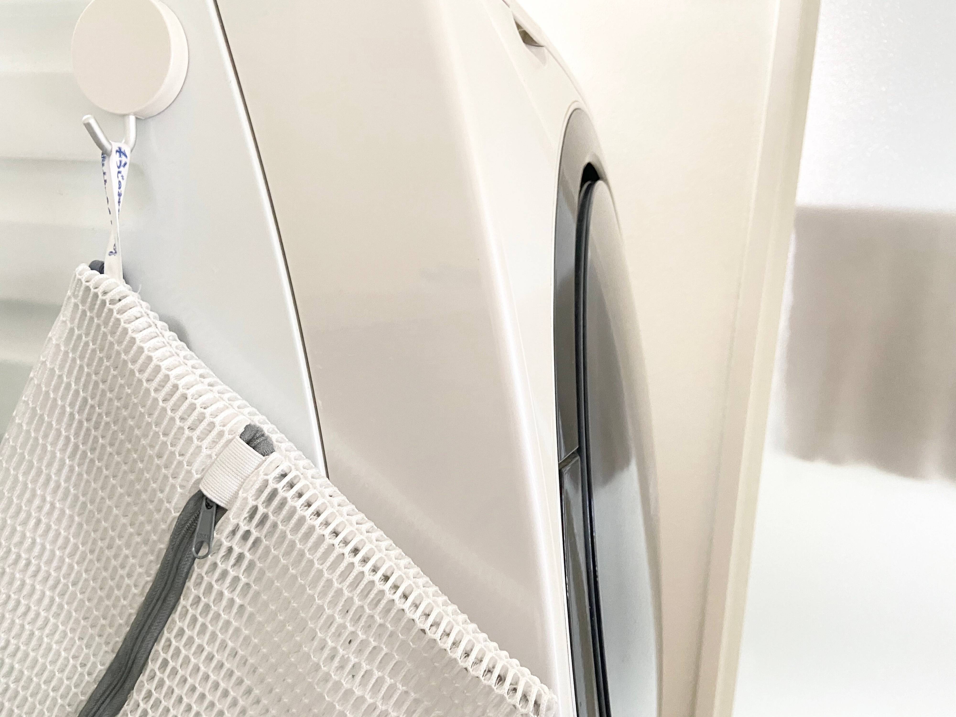 洗濯機で上靴や靴を洗う場合のシューズネットは洗濯機横に引っ掛け収納しています。