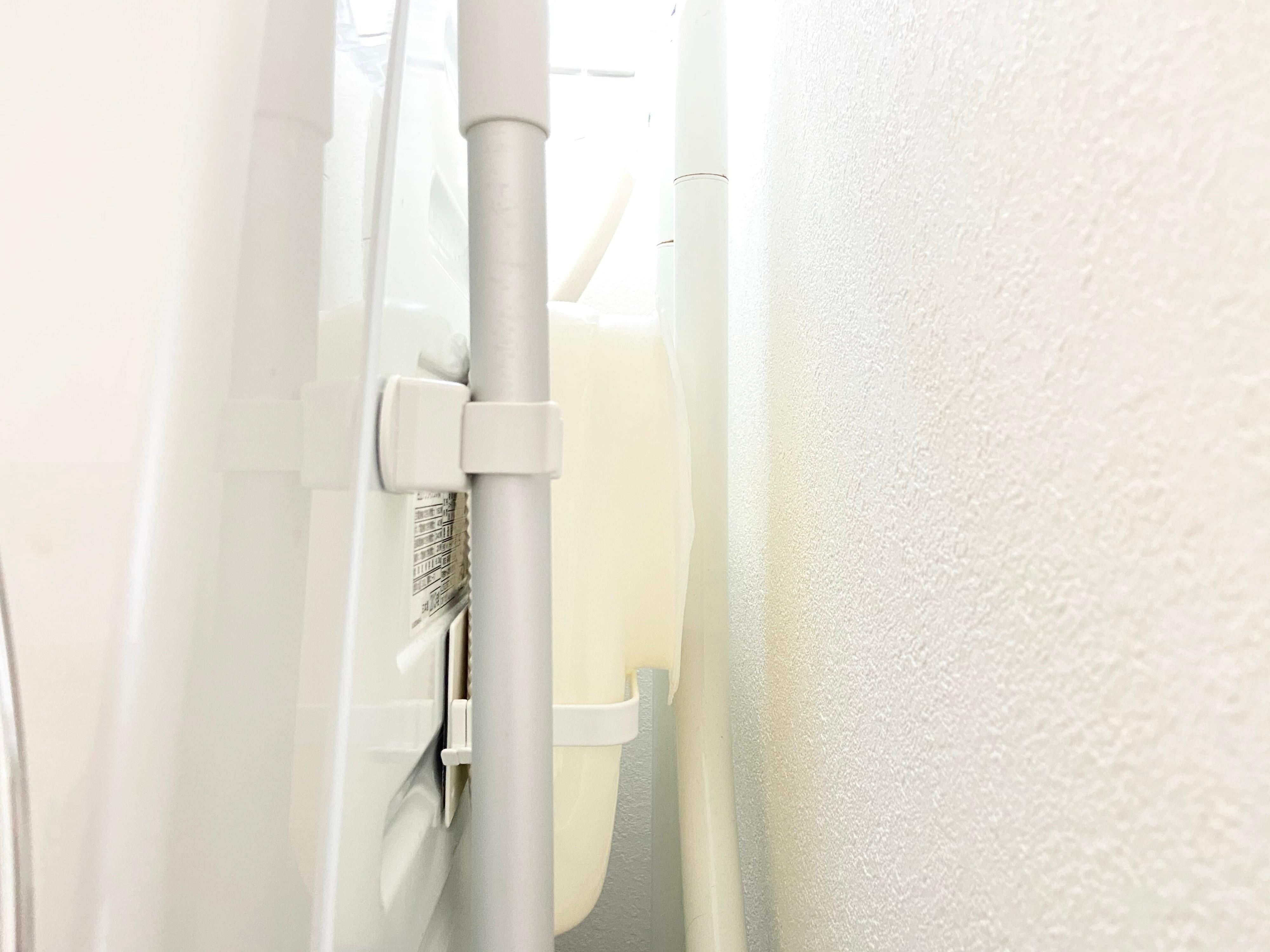 お風呂場で使うバスブーツは、洗濯機のお風呂場側にTowerのマグネットバスブーツホルダーを使って収納。その横には、フローリングワイパーをセリアのワンキャッチを貼り付けて収納しています。お風呂場側は洗面所の扉から死角であまり見えないので、色々収納していても全く悪目立ちしません。