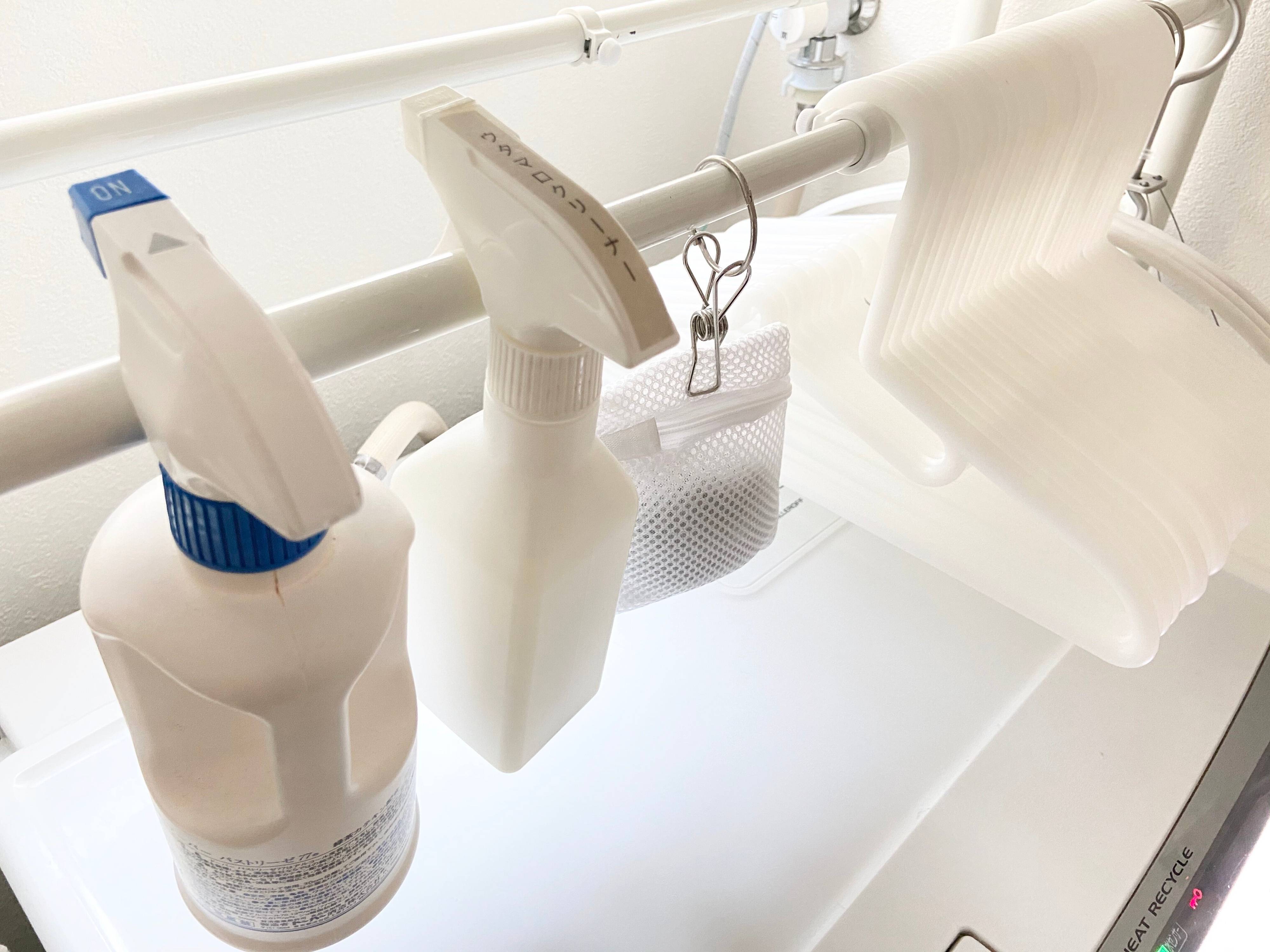 毎日のキッチンリセットに欠かせないパストリーゼと、洗面シンクやその他の汚れ諸々に使っているウタマロクリーナーはラックに引っ掛けるだけの収納に。その横にはランドリーマグちゃんも。使ったらここに挟んで乾かすだけ!とっても便利なんです。