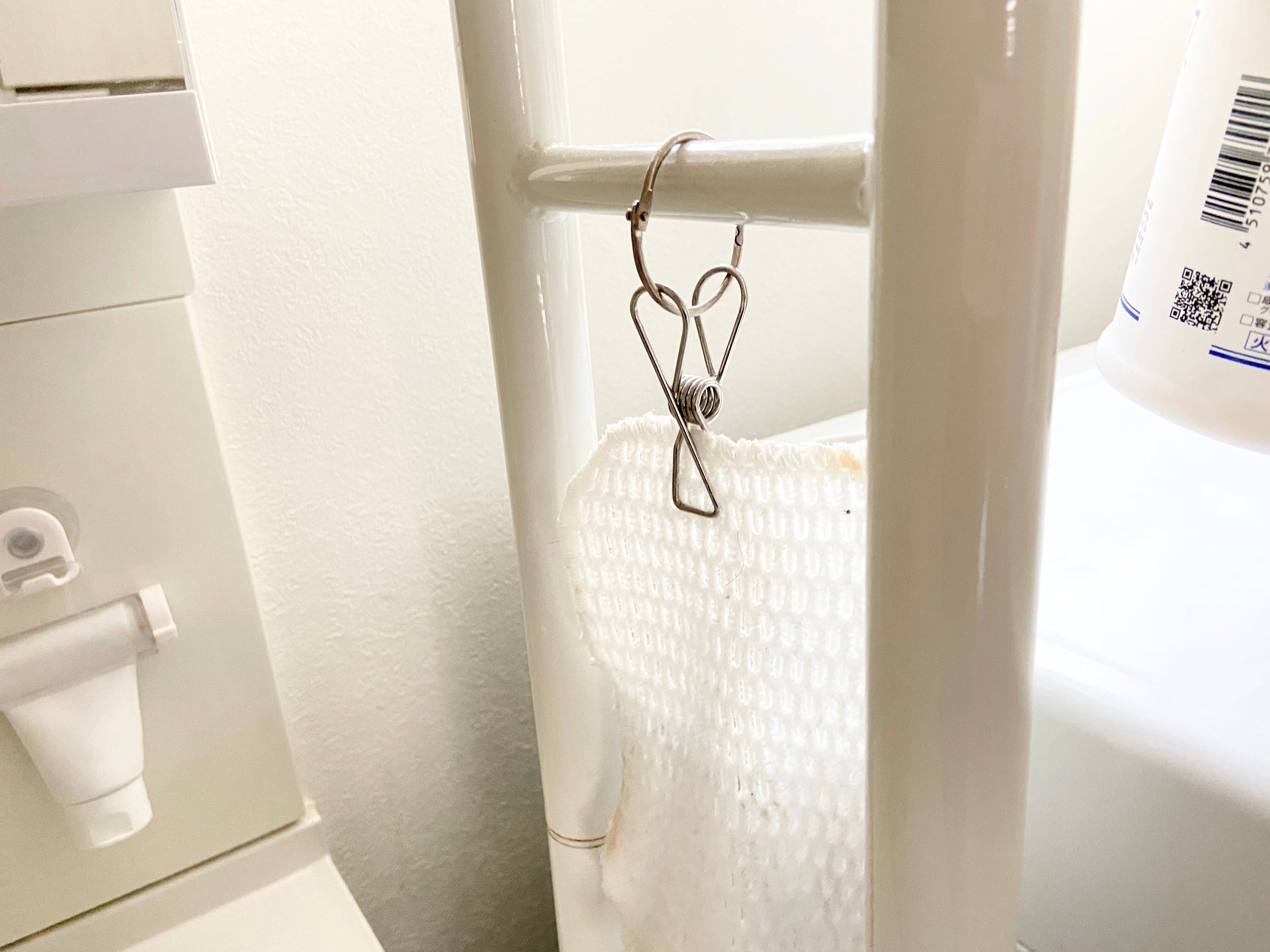 毎朝洗顔のついでに行う洗面シンクの掃除用のアミタワシも、ラックに吊るし収納しています。毎日使うものは、使う場所から最短の位置にセットすることを心がけています。