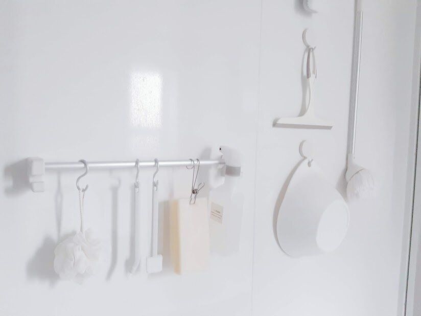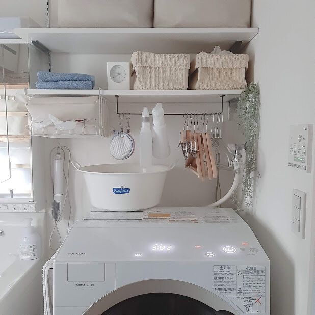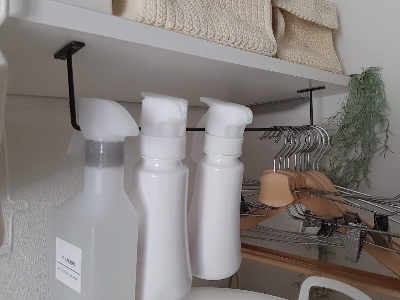 洗濯機上のスペースの棚にセリアのアイアンバーを取りつけています。木製の棚にビスで打ち込んでいるので強度も抜群。衣類洗剤やお風呂用の洗剤、ハンガーを何本もかけてもびくともしません。毎日使うものはすぐに取れる位置に置いておくとストレスフリーです。出しておいてもおしゃれなグッズを使用すれば見た目もGOODですね。