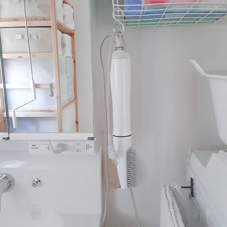すぐに手に取れる場所に吊るす収納にしてからは元にもどしてくれるようになりました。3COINSのラックにS字フックを取りつけ、ドライヤーの輪っかに引っかけます。コンセントから近いところも使いやすさのポイントです。