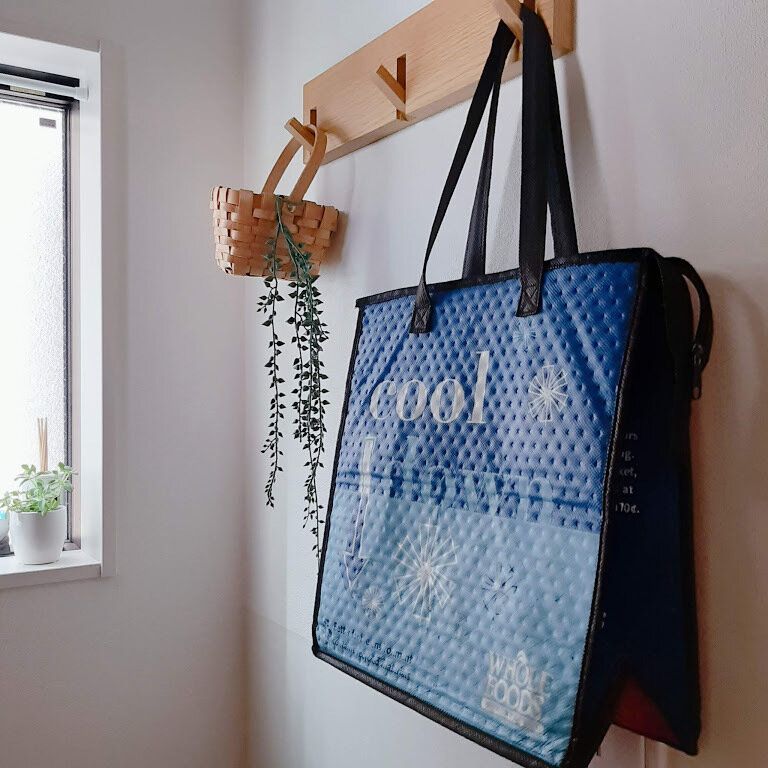 エコバッグが必須になってからエコバッグは玄関前に吊るしています。こちらも同じく無印良品の「壁に付けられる家具」。近所のスーパーに行くときにこちらから持って行く流れです。玄関に置いておけばエコバッグを忘れて悔しい思いをすることもなし!
