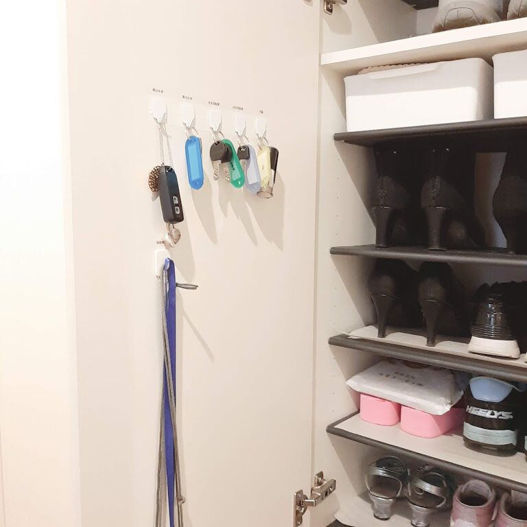 下駄箱の扉の内側に家や自転車の鍵、印鑑を吊るしています。急に宅配便が来ても慌てませんね。ボックスなどに入れておくよりも一目で見てわかるのでガチャガチャ探す手間がなく楽ですよ。下地にマステを貼った上に両面テープのフックをつければ扉を傷つけることもありません。
