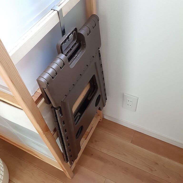 子どもが使ったり、私が高いところのものを取るときに使用する踏み台。わが家では折りたたみタイプのものを使用していますが、取っ手の部分にフックをかけて吊るしています。無印良品のパイン材ユニットシェルフにイケアのフックがぴったり。洗面所は髪の毛などが落ちやすく頻繁に掃除機をかけるのでどかすひと手間がないだけで断然楽に。