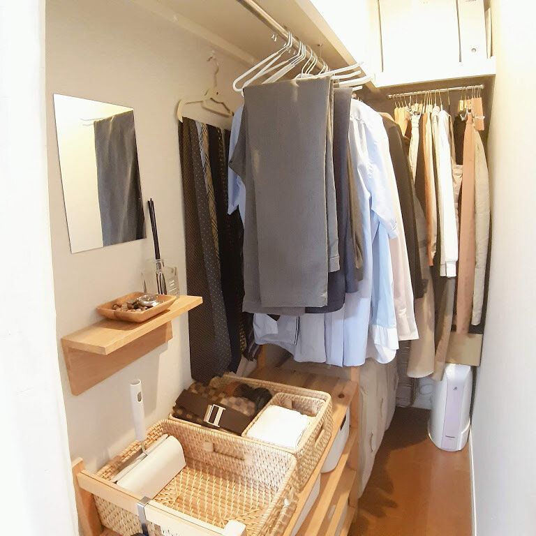 片づけ苦手な夫が唯一続けられているネクタイ収納です。滑りにくいハンガーを壁にさしたピンに吊るしています。ネクタイが滑り落ちることもありません。取りやすい左側から使用頻度の高い順に配置すれば簡単に取ることができますし、使っていないネクタイを見極めることもできます。ピンは石膏ボード専用のものを使用しています。