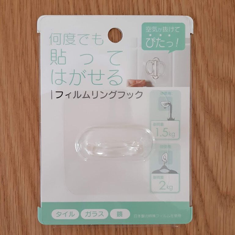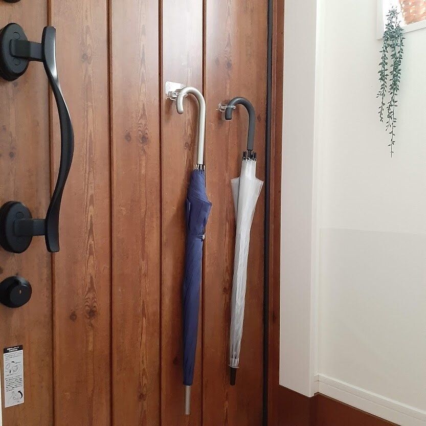 セリアの「何度でも貼ってはがせるフイルムリングフック」を玄関扉の内側に貼りつけています。ぬれた傘の一時置きなどに使用するのに便利です。このシリーズは大人気で店舗によっては品薄のこともあるので、見つけたらゲットしておくことをおすすめします。