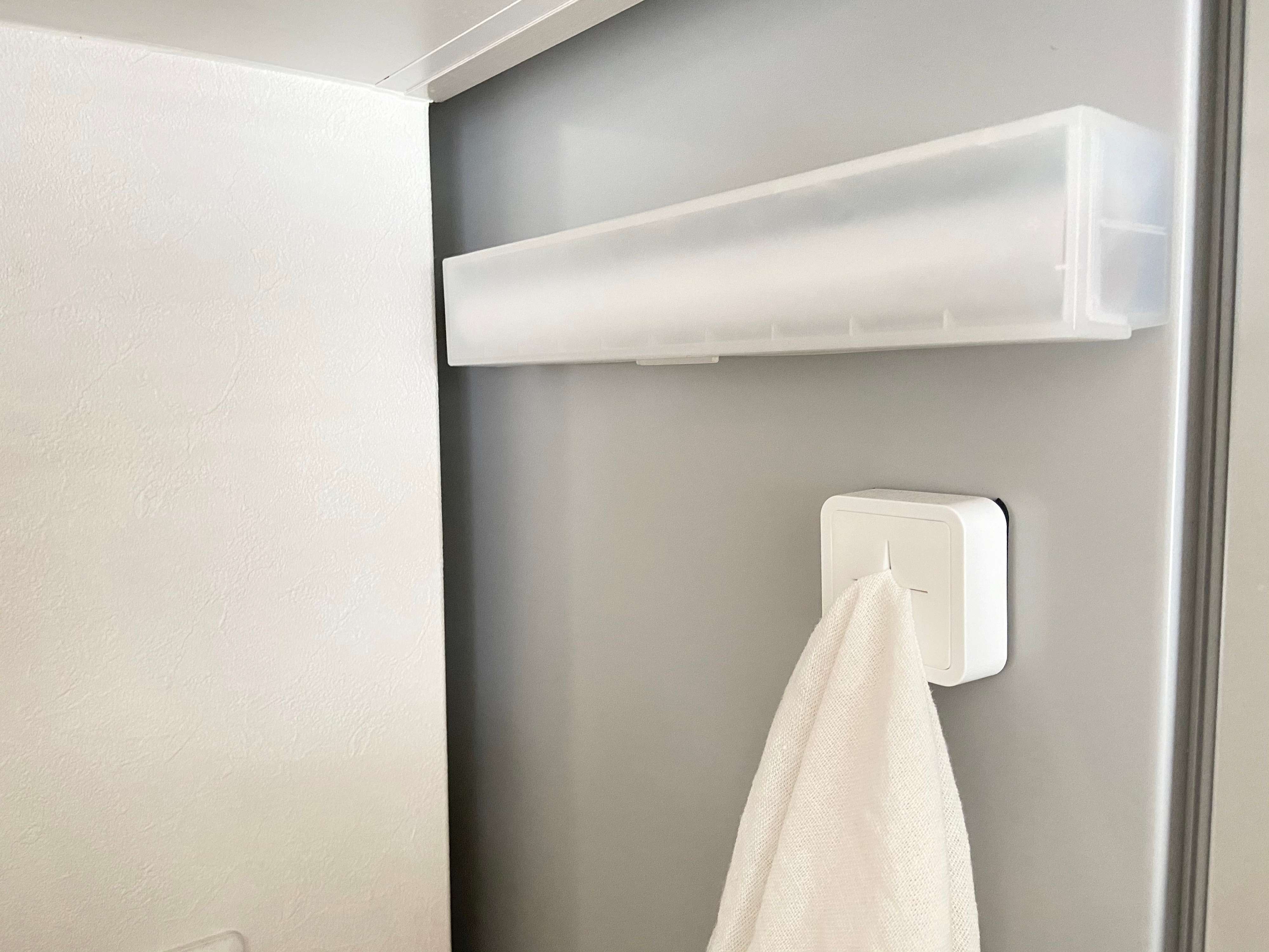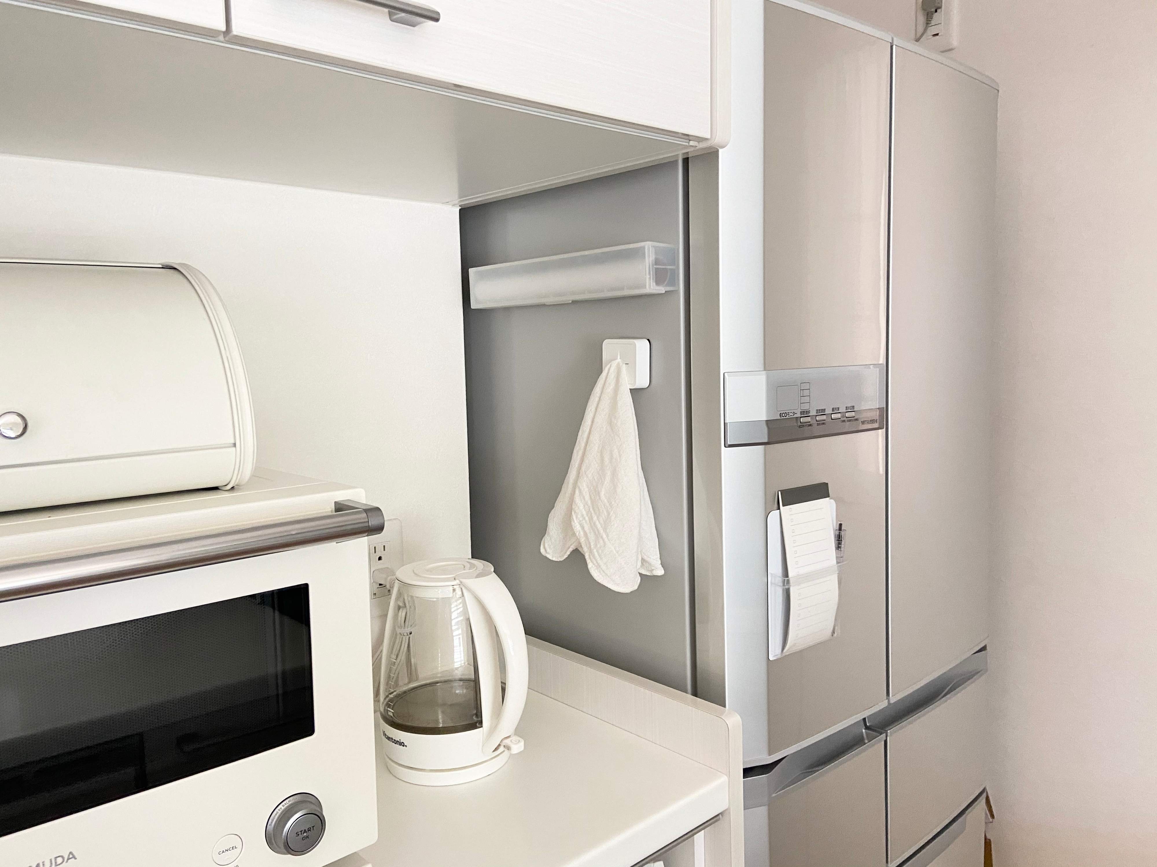 わが家が冷蔵庫の側面に収納しているのはサランラップと食器用の布巾です。ラップは無印良品のポリプロピレンラップケース(大)と専用マグネットを貼りつけたものと、ニトリのシンク扉タオルホルダーです。