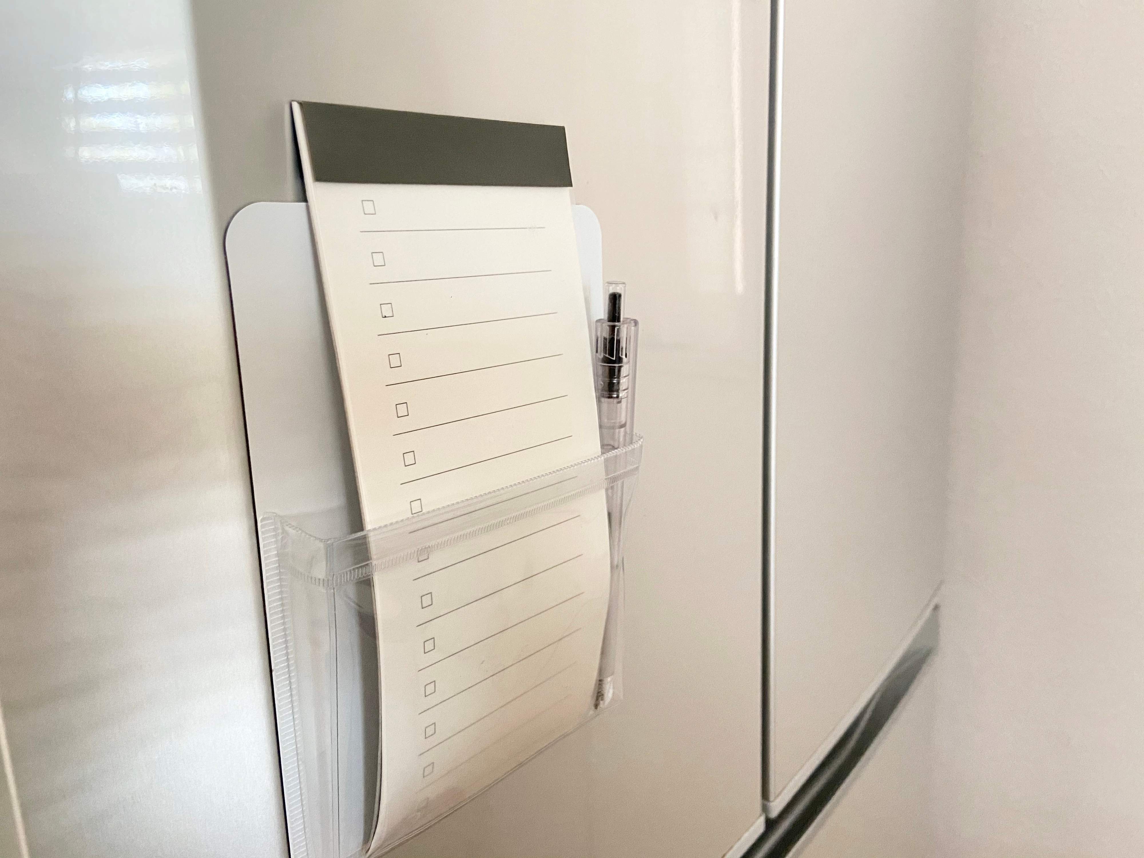 冷蔵庫の扉にはキャンドゥのマグネットポケットに無印の短冊型メモ チェックリストとペンを収納しています。