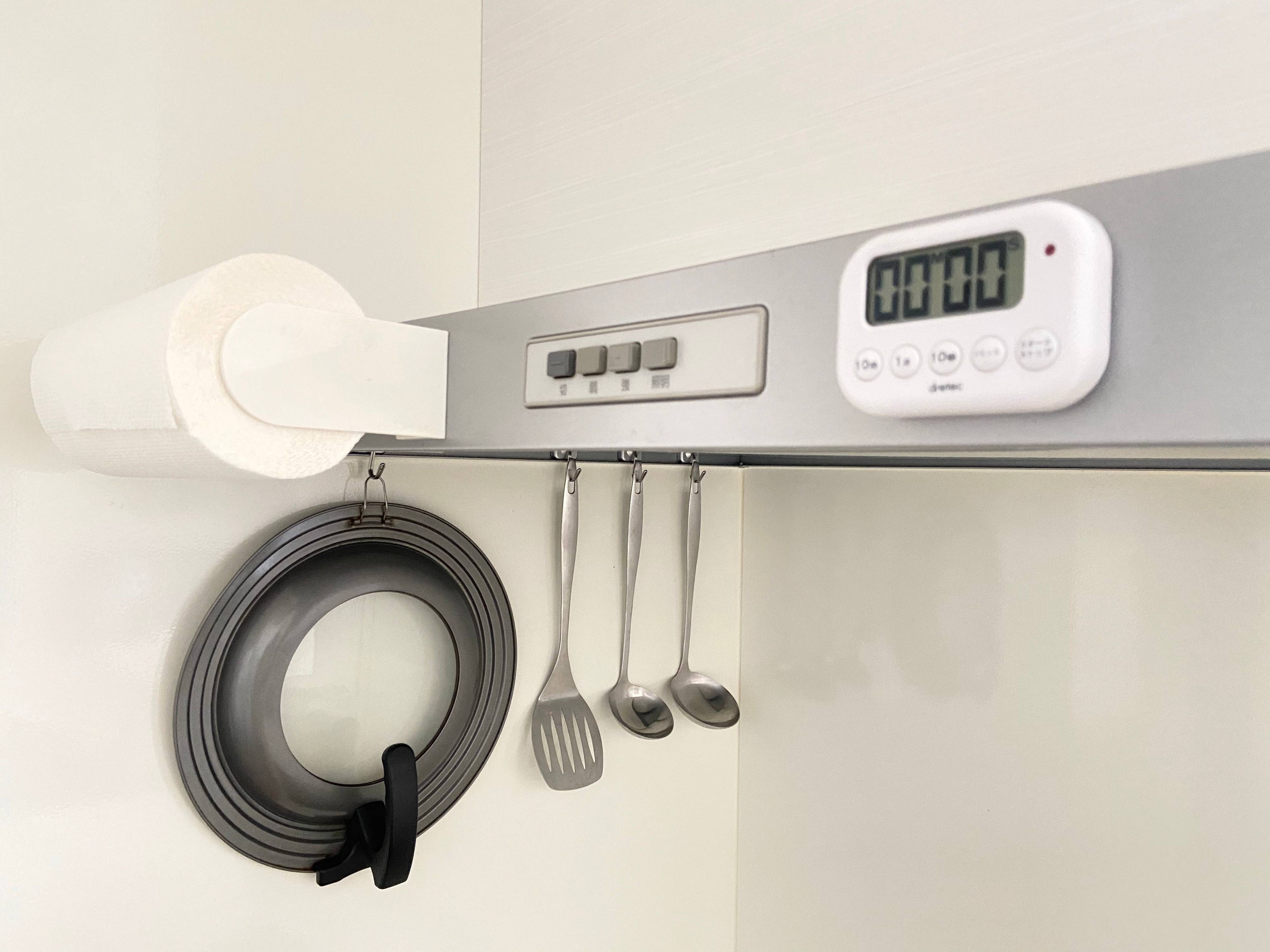 わが家ではおたま、フライパン返し、フタを強力マグネットフックで吊るしています。キッチンペーパーは無印良品のキッチンペーパーホルダーを使って浮かせており、タイマーは元々マグネットつきのものを選んでいます。