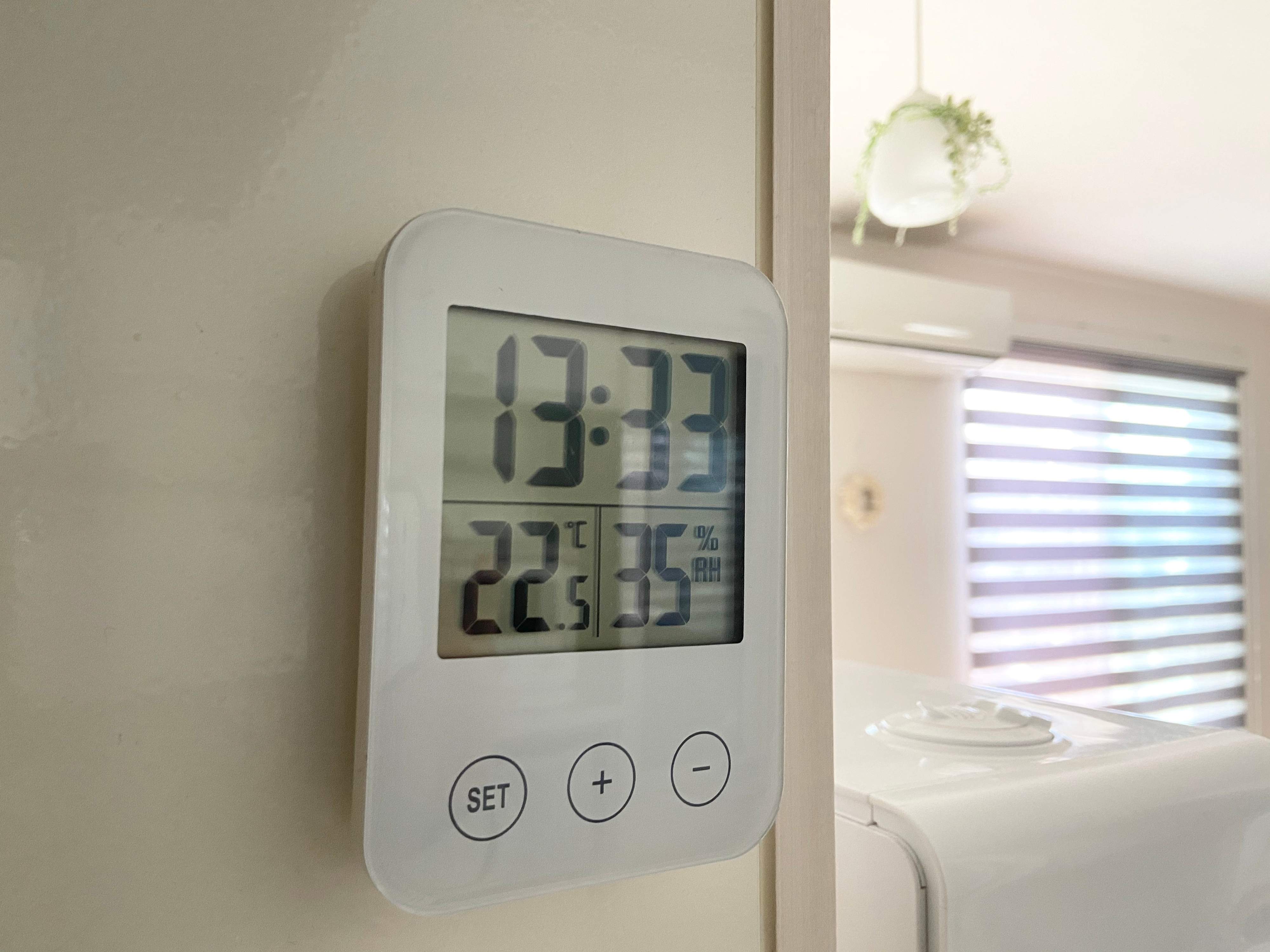 マグネットがくっつかない壁面には、あると便利な温湿度計つきのIKEAの時計を100均の面ファスナーを使って空中収納にしています。
