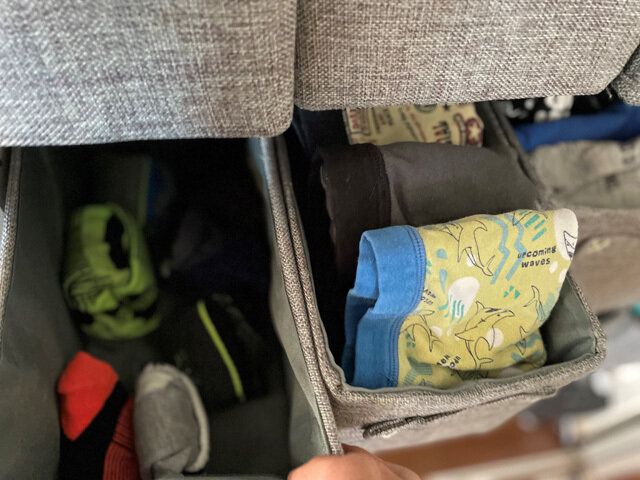 タンスやクローゼットにカテゴリごとに仕分けて、収納を作る(きちんと)→その中は子どもたちで管理させる(ザックリ)と、このようにきちんと仕分けておけば、多少中はザックリでも、OKという仕組みです。
