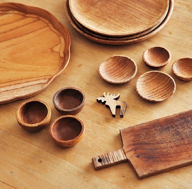 「温かみが感じられる、木の器が好き」と万波さん。使うほどに味わいを増し、手入れも簡単。「料理がさめにくく、気兼ねなく使えるのもうれしいところです」。小さい器はスプーン置きや卵置きとして使用。