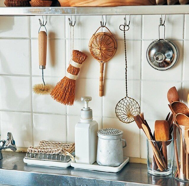 日用品をかわいくするのも万波さんのルール。シンクまわりの日用品こそお気に入りを選んでいます。家事のモチベーションを上げてくれるし、つるしておくだけで絵になります。「スポンジやたわしは自然素材をチョイス。無印良品の白いスポンジもよく使います」。