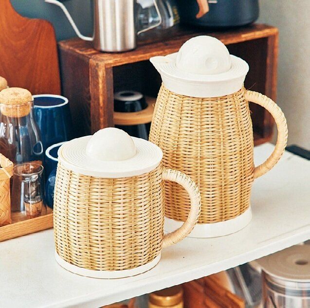 愛用していた籐ポットが壊れてしまい、メルカリで探してみたところ、色違いを破格値で発見! お店ではなかなか目にしない、レトロなデザインに一目ぼれ。ポットには白湯を、おそろいのアイスペール(写真左側。氷を保管しておく容器)には青汁の粉末や、のみ薬を入れています。