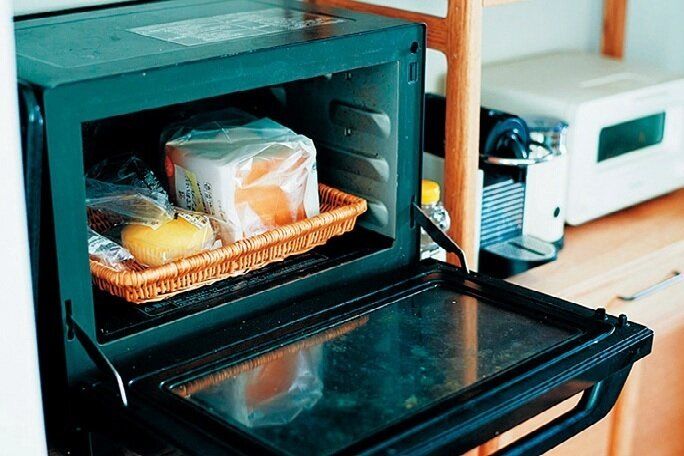 電子レンジは常に使っているわけではないので、収納スペースとして活用しています。出しっ放しだと生活感が出てしまう食パンを隠すのにもぴったり!
