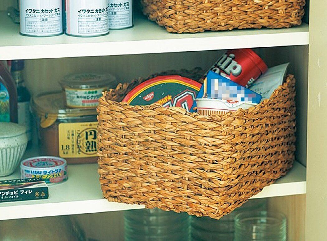 食べ盛りの子どもの小腹を満たすためのスナック菓子やカップ麺は、食品庫の中に。たくさんあると食べすぎてしまうので、このカゴに入る分だけキープしています。