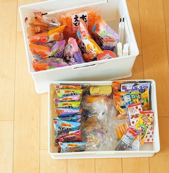 大きい袋物は深めのケースに、小袋や小箱のお菓子は浅いケースに分類。入っている物が見渡せるので、食べたい分だけすぐに取り出せます。