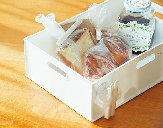 パンの専用ボックスは、キッチン背後の棚に。ボックスの側面には、吸盤つきホルダーで袋留めクリップをセット。食べかけの物もその場ですぐ留めることができます。