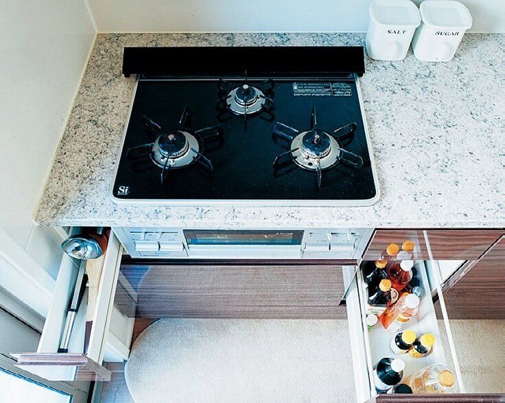 調味料をプラカゴに入れてコンロ横に置いていたら、熱で溶けてしまうという失敗が!コンロに近い引き出しに入れ、使用時は開けっ放しにすることで安心&出し入れがラクに。