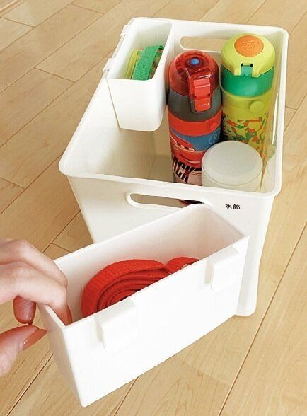 子どもの水筒は、ニトリのNインボックスに立てて収納。ショルダーひもはフックつきポケットに入れて、ボックスに引っ掛けておけば、奥のほうに迷い込むこともありません。