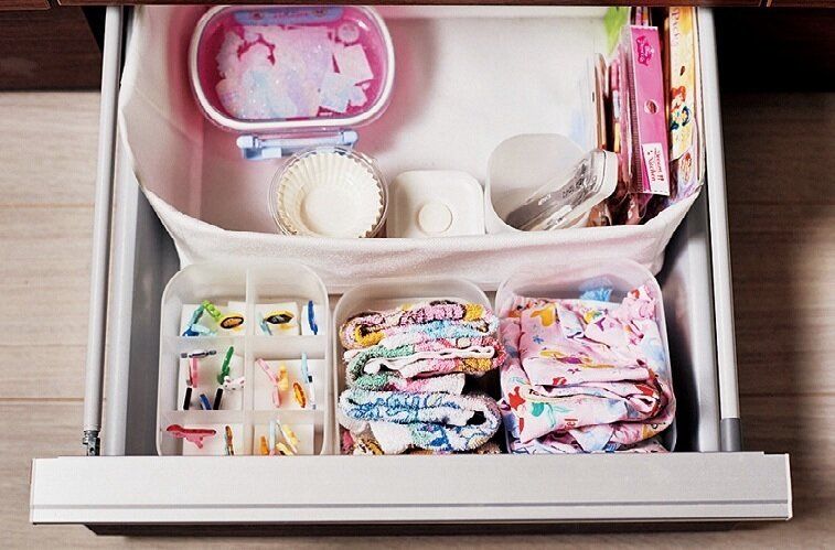 深い引き出しも書類ケースで仕切れば、割れやすいコップやマグカップも収納可能に。1つずつ重ねずに入れられるので、上から取るのも簡単です。