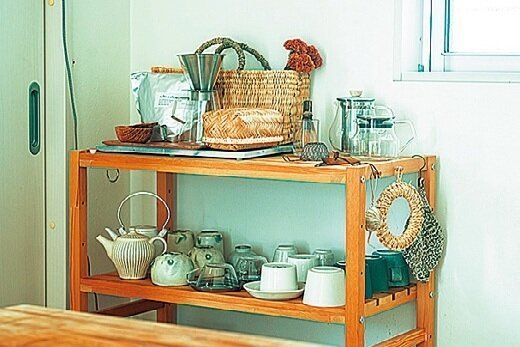 ティーポットやカップは、引き出しにしまい込まず、キッチン横のオープン棚に。コーヒーサーバーや茶葉などもセットしてあるので、家族がそれぞれ好きなときに飲めます。