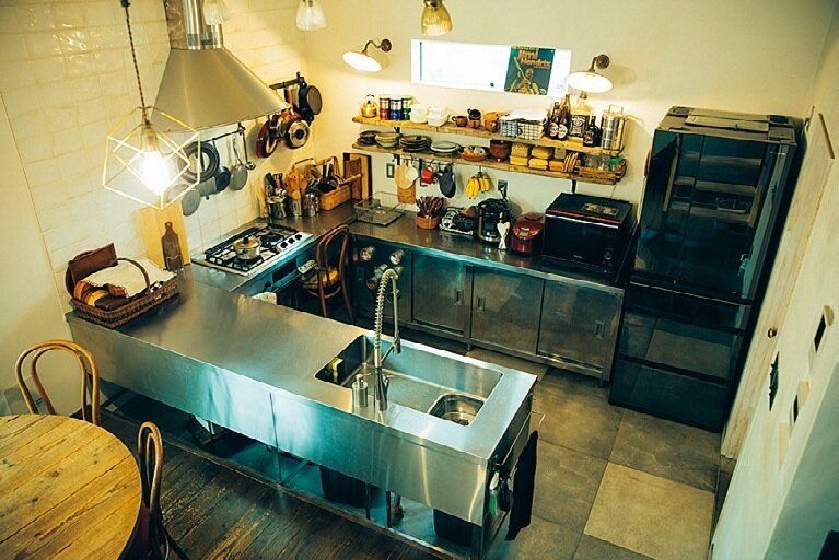 床が1段下がっており食卓に座った家族と目線が合う。業務用のシンクや作業台は自ら探したそう。