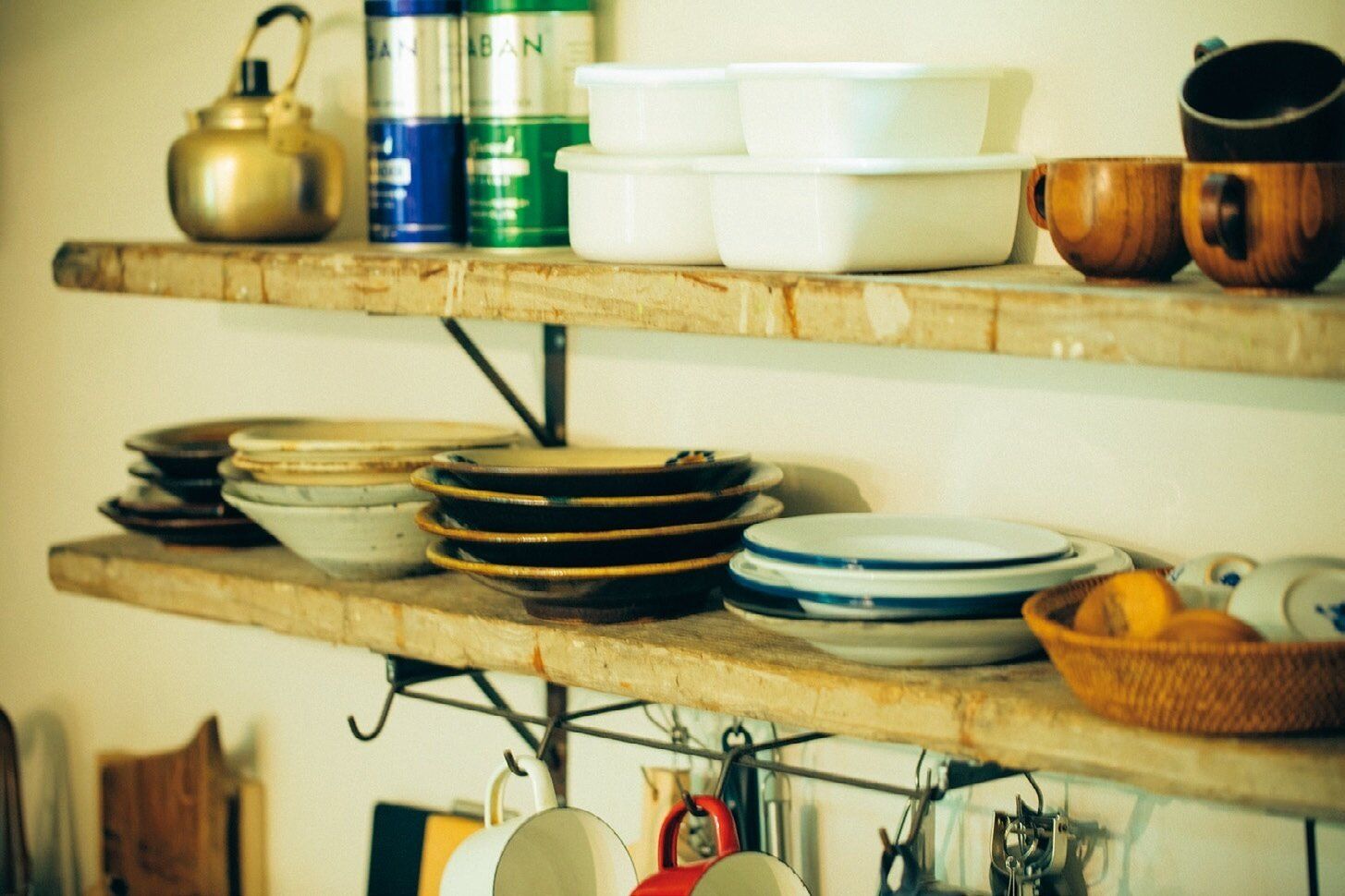 毎日使う器は、とにかくサッと取り出せることが大事。だから、あえてしまわず、オープンシェルフに並べて収納。探しやすいし取り出しやすく、見た目も美しい!