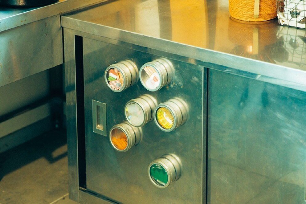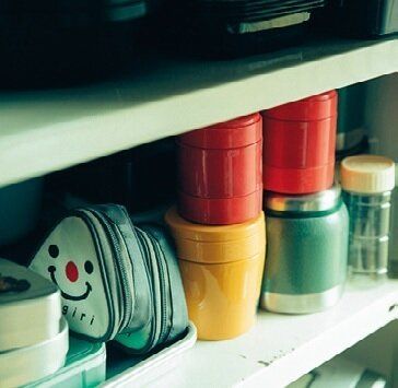 こまごましたべんとうグッズは、種類ごとにマグネット式の缶に入れて棚の扉にくっつけておきます。中身が見えてわかりやすいうえに取り出しやすく、おまけにかわいい!