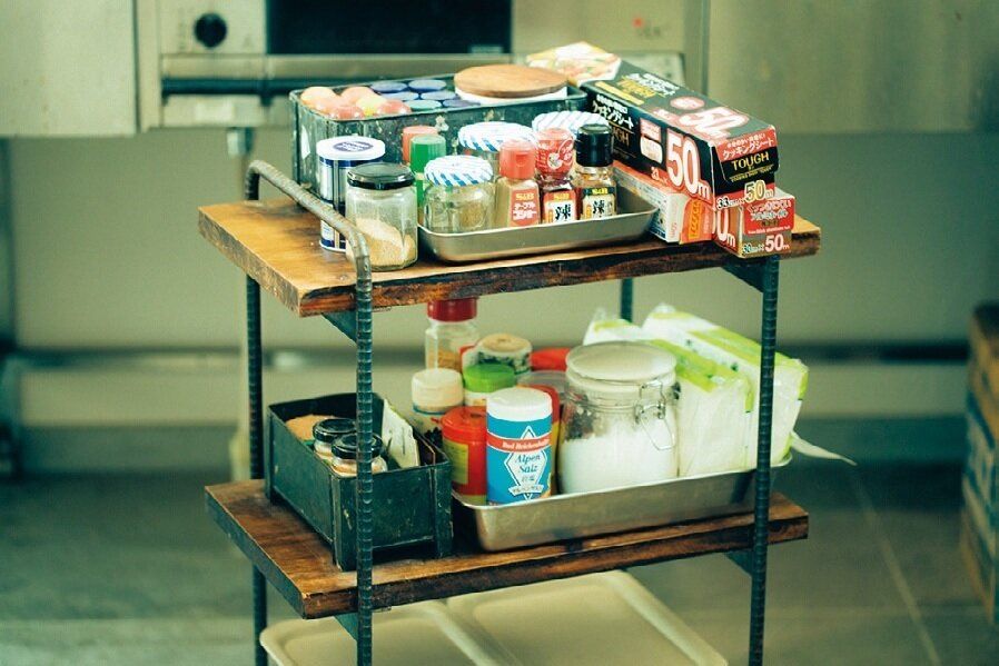 調味料は、可動式のワゴンにのせカウンターの下に保管し、使うとき引き出します。よく使う物を上段に置き、背の高いボトルや粉類は中段へ。使い終えたらワゴンごと戻します。