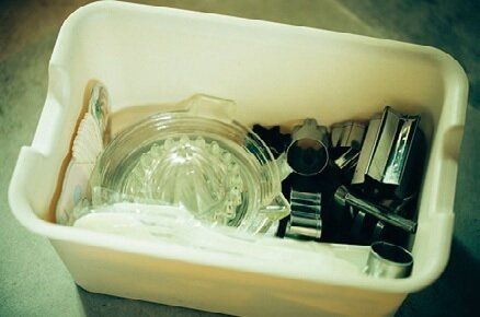スクイーザーなど、ふだん使わない物が入った箱。「用途で分類してもどこに入れたか忘れるから、超たまに使う物でまとめました」。