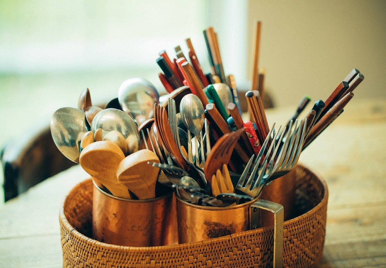 家族共有で使うカトラリーは、種類ごとにまとめてカップに入れ、カゴごとテーブルへ。各自使いたい物を取り出せば、配膳の手間もなし!