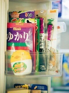 冷蔵室を開けてすぐのポケットは、子どもたちが好きなふりかけ置き場。いちいち「どこ?」と聞かれないように、袋を本のように立てて保管。忙しい朝でもひと目でわかります。
