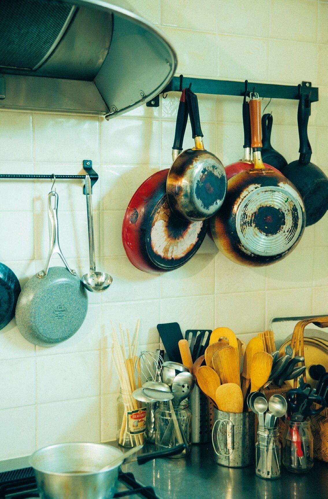 小さめのフライパン類やフライ返しなどの調理道具は、素材別に立てて収納。たくさんあって雑多な道具類も、木やステンレスなど素材別に入れると探しやすく、料理がはかどる!