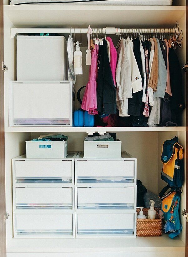 子どもが立って手に取りやすい引き出しに、給食袋やサッカーの練習着、ハンカチなどを収納。「通学、通園の服は、私が選ぶことが多いので、上段のハンガーに掛けています」。