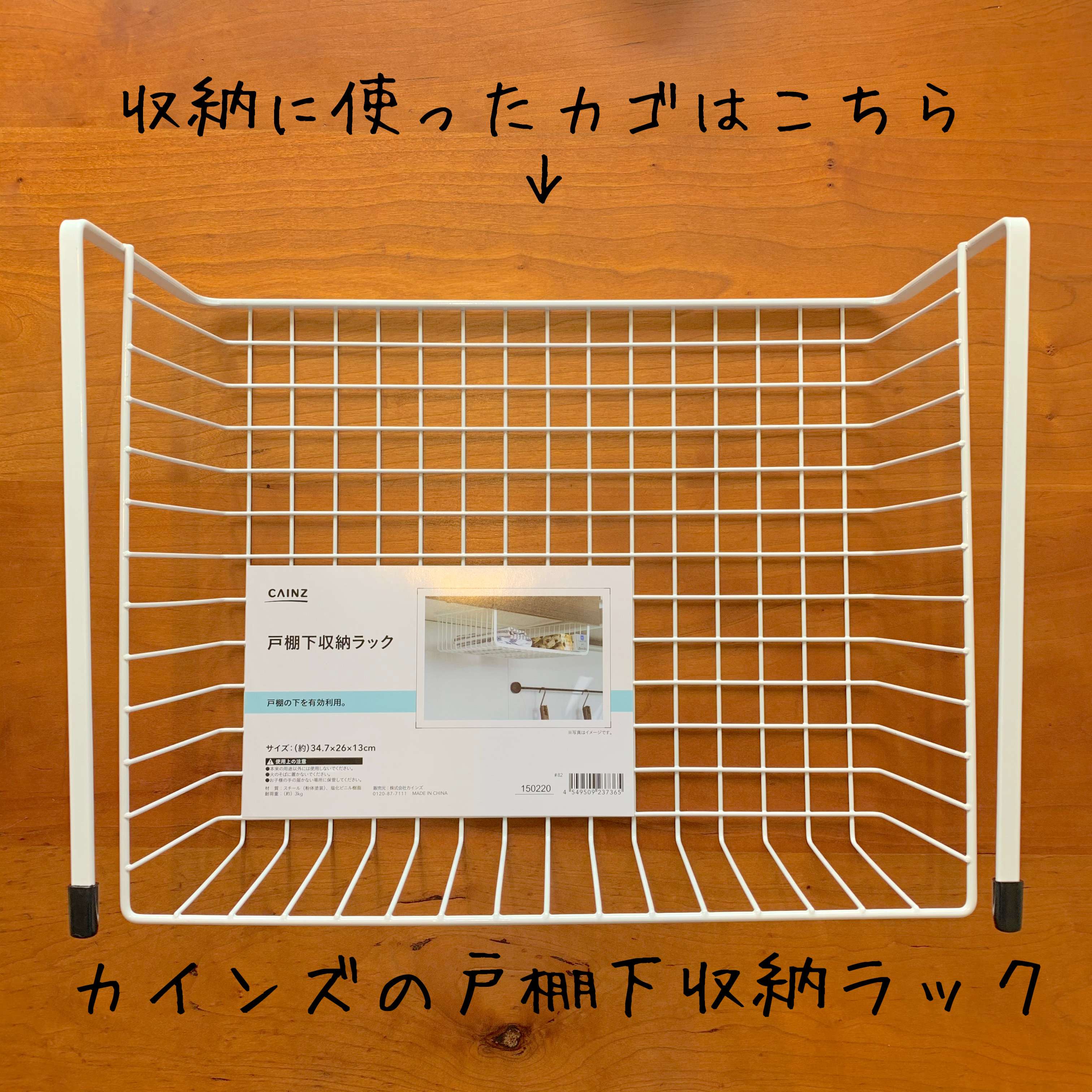 収納に使ったカゴはカインズで購入しました。戸棚下収納ラックという商品です。100均でも似たものがありましたが、サイズが少し小さく、大きめのカインズの商品を選びました。他にもバッグを入れたいので、もう一つ購入する予定です。
