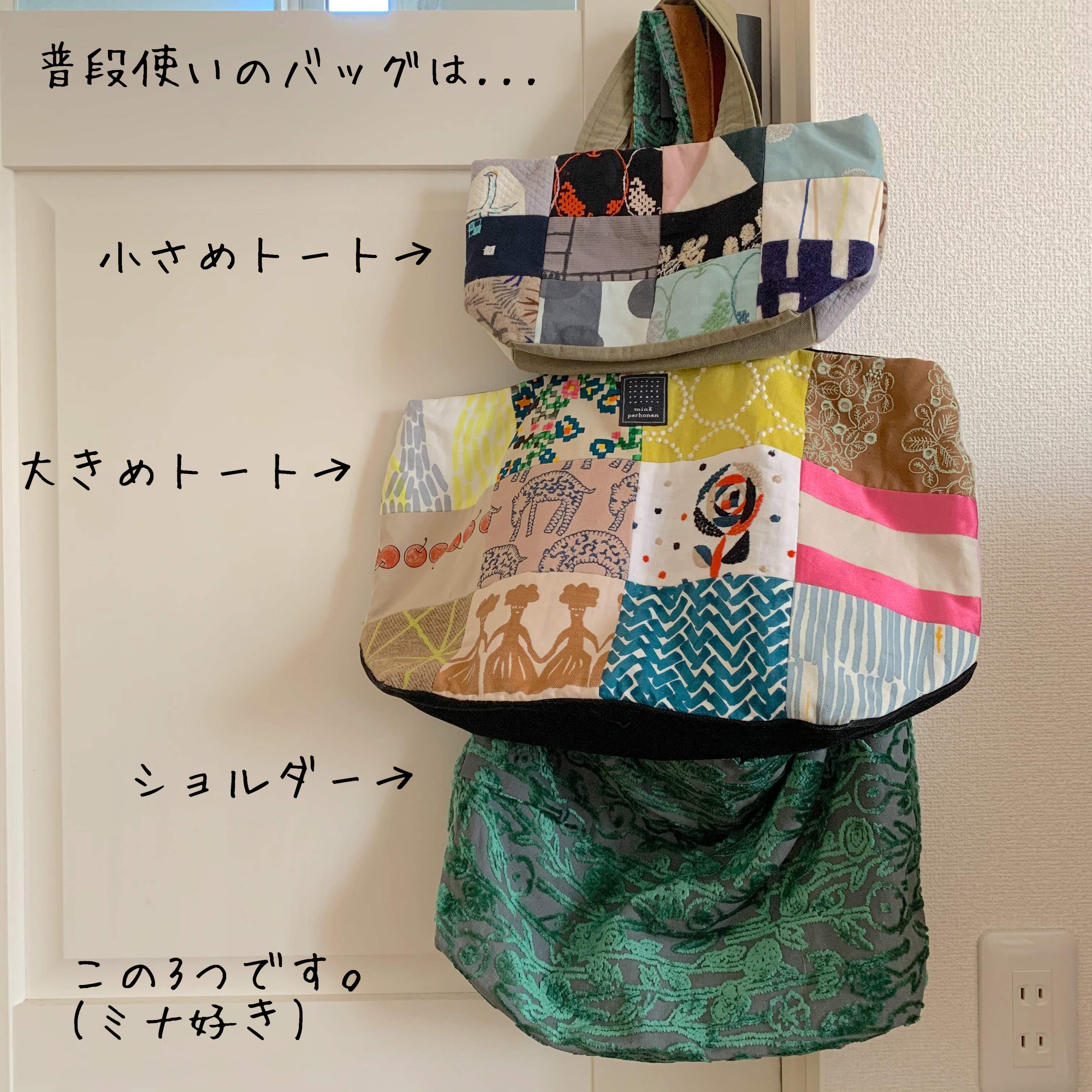 普段使い用のバッグは小さめのトートバッグ、大きめのトートバッグ、大きめのショルダーバッグの3つです。これ以外に、仕事用のバッグと冠婚葬祭用のバッグ、旅行用の大きめのバッグを持っています。(冠婚葬祭用と旅行用のバッグはあまり使わないので納戸に収納しています)バッグは増えがちですが、ミニマルライフを心がけています。