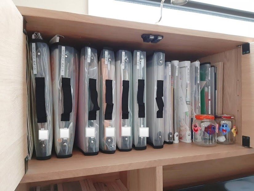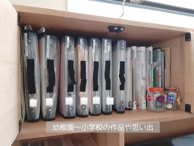 実際に幼稚園や学校から持ち込まれてもすぐに収納することができるので散らかりません。自分の作品がいつまでも放置されていたら何だか悲しいですもんね。子どもも頻繁に過去の作品を眺めています。