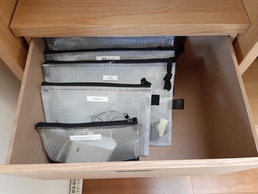 子どもの作品は厳選してセリアのファスナーケースに収納しています。幼稚園で姉妹1冊づつ、小学校は数冊に分けています。中身は作品だけにとらわれず思い出の品、作文、授業で使ったノート類も厳選して入れています。今後増えたら更に厳選していく予定です。