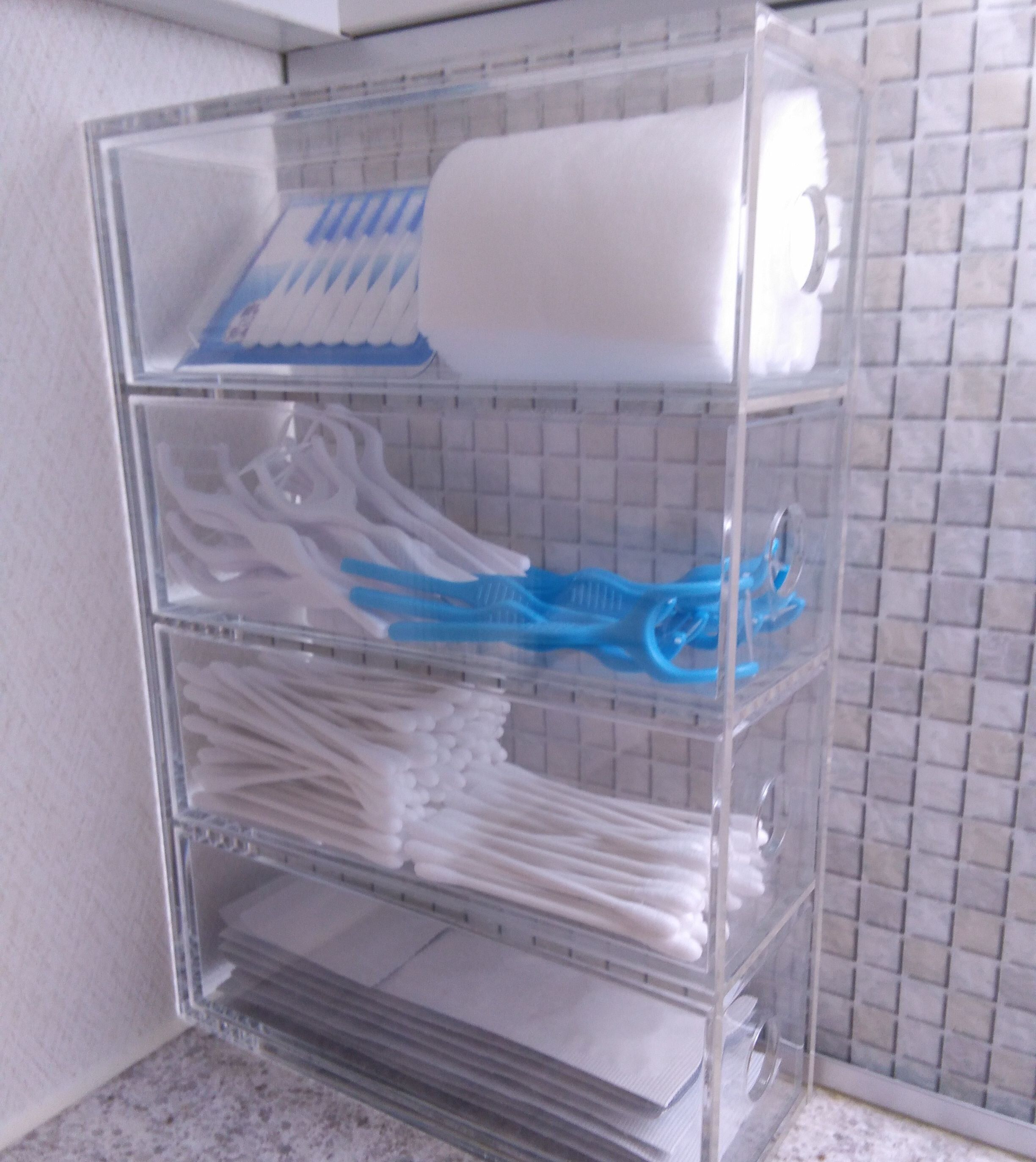 もともとはメガネケースとして購入した無印良品のアクリルケース(4段)ですが、現在は洗面所で家族共有の小物入れとして使っています。