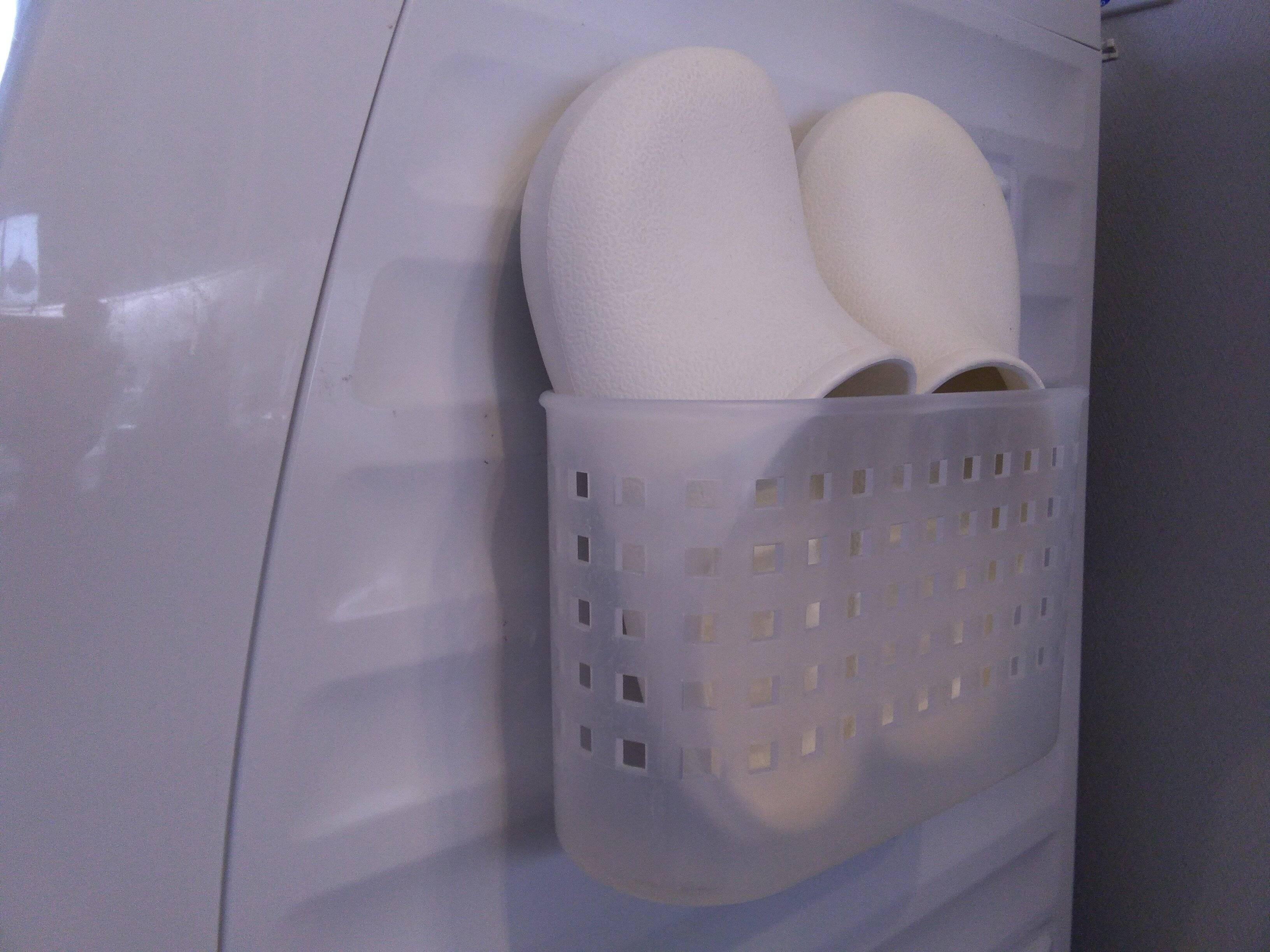 バスブーツの置き場に困っていたところ、ちょうどいいケースを見つけました。裏面はマグネットが3つついているので、洗濯機の横にセットしても簡単にずり落ちることはありません。
