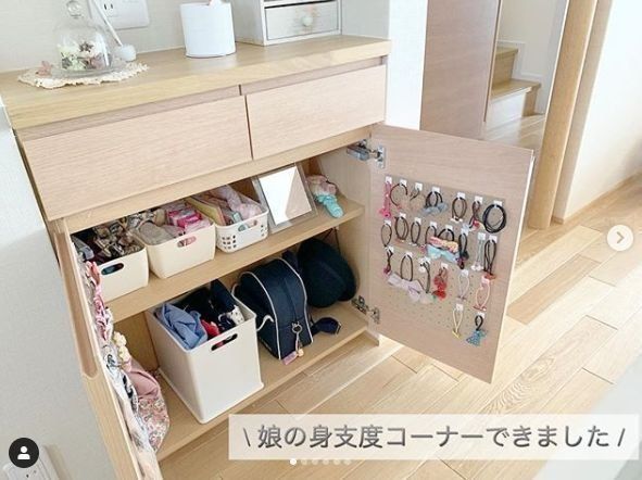 入園、入学が近づくと、身支度コーナーを用意する必要がありますよね。特に女の子はヘアゴムなどのヘアアクセサリーなどもあり、小さなものが多くなりがち。そんなときに100均の収納ボックスやフックを活用すればきれいに収納することもできます。忙しい朝もスムーズに支度ができそうですね。きれいに整っていれば子ども自身も自分ですすんで支度をしてくれるようになるかもしれません。