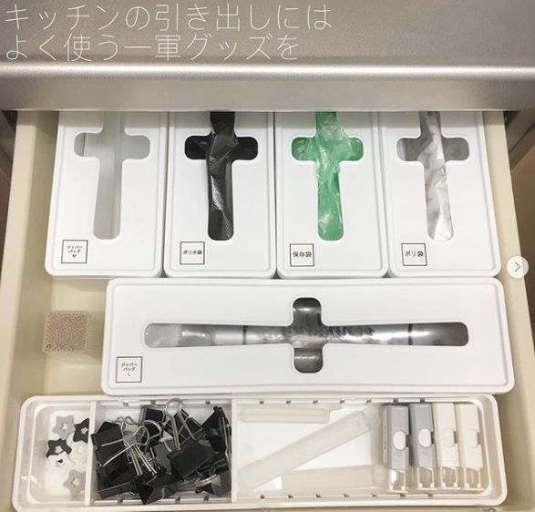 セリアで話題になっているのがこちらのプルアウトボックス。さまざまな種類がありますが、長いタイプはポリ袋や保存袋の収納にぴったり。ふたを開けずにとりだすことができるから、使用する頻度の多いものの収納に適しています。取り出しやすく、きれいに収納可能。小さめのサイズもありますので、ぜひ活用してみてください。